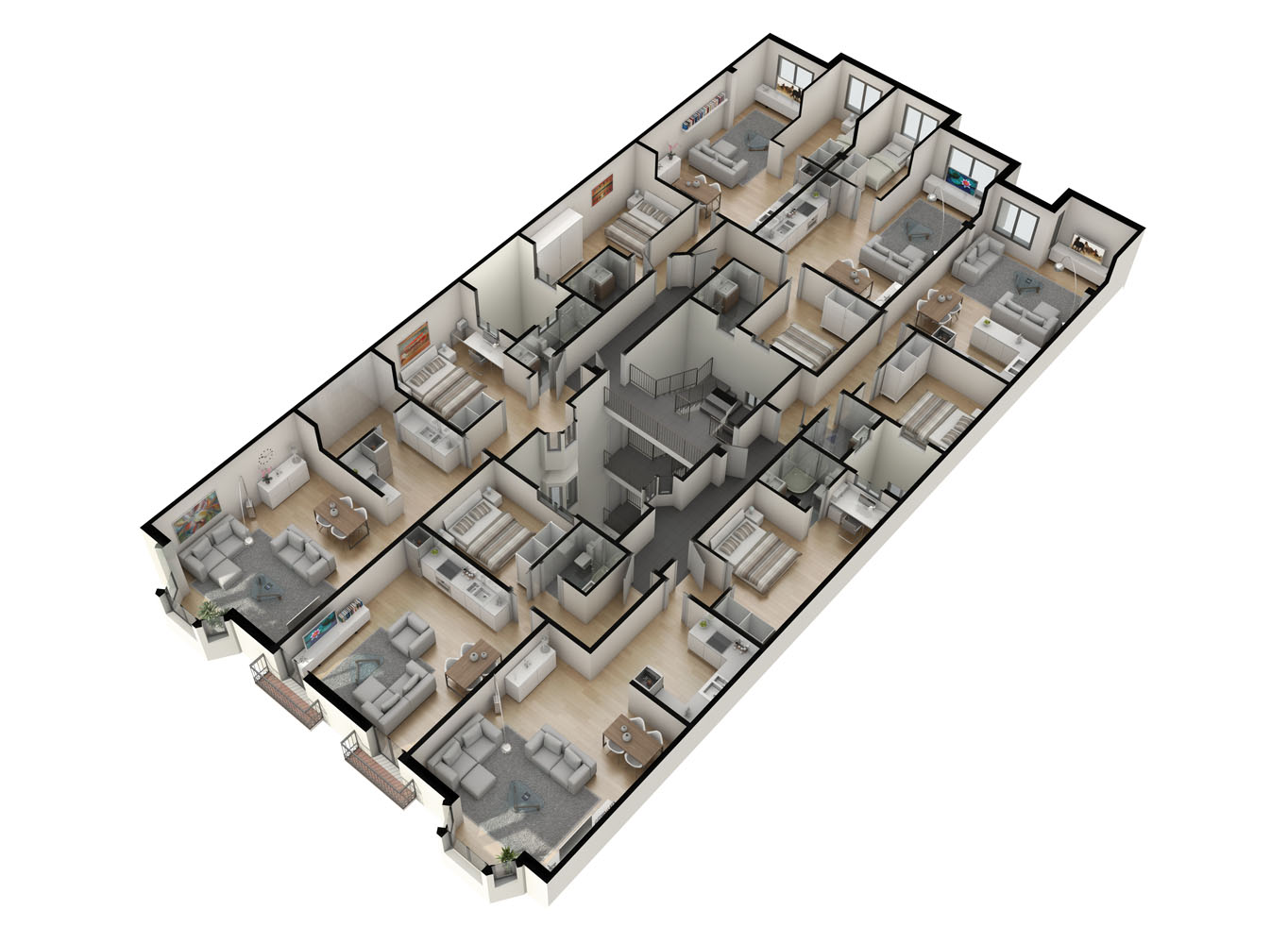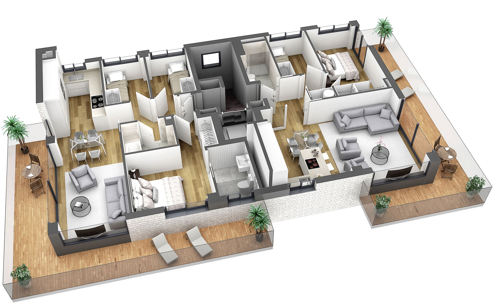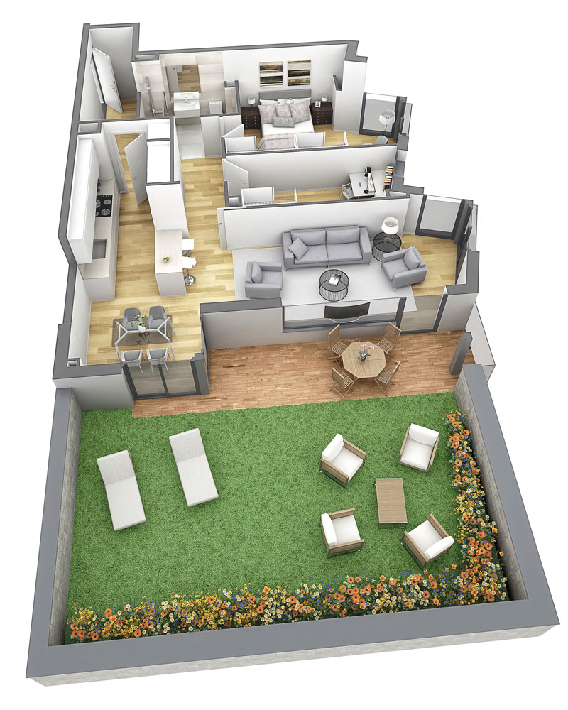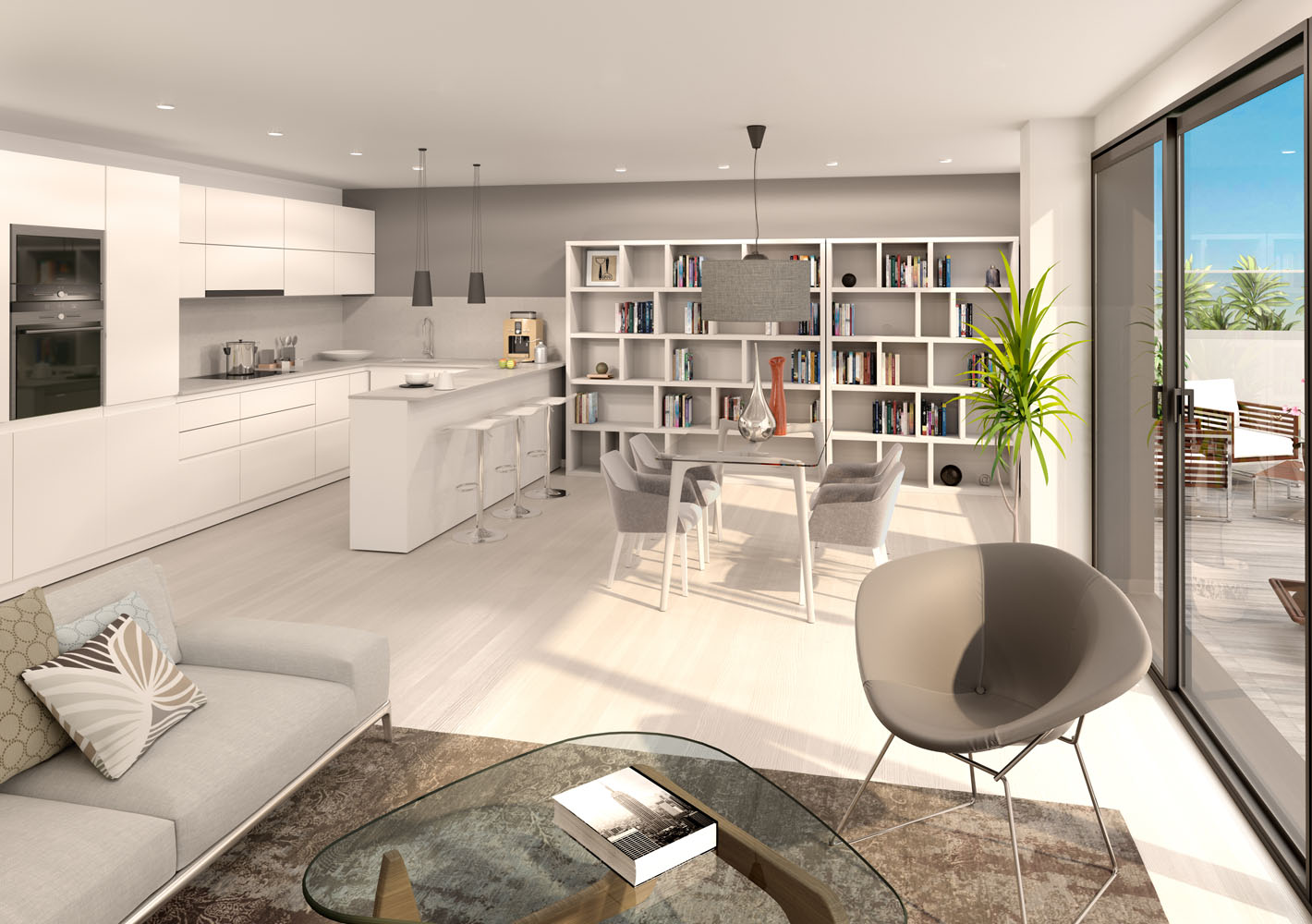 Imágenes 3D fotorrealistas para marketing de promociones inmobiliarias, planos comerciales o de venta en 2D y 3D.
